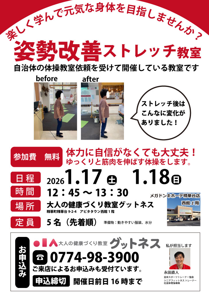 姿勢改善ストレッチ教室 2026.01.12 身体のバランスを整えて姿勢を改善します。 2026年1月17日(土)・2026年1月18日(日)12:45~13:30 参加費 無料 体力に自信がない方も大丈夫ゆっくりと身体を伸ばします。