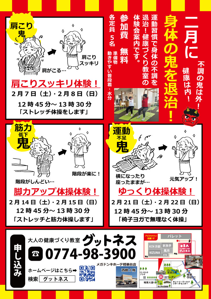 2月14日(土)2月15日(日) 筋力低下の鬼退治!「ストレッチ体操と筋力体操」